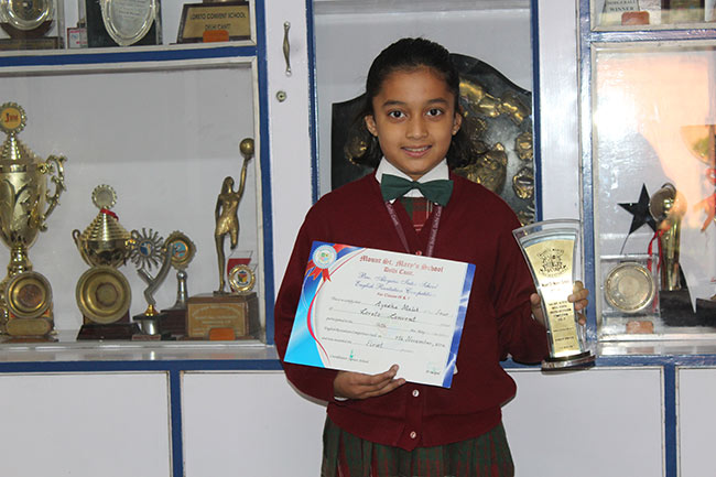 Ayesha Malik of class IV B won the First Prize at the Aloysius Inter School English Recitation Competition organized by Mount St. Mary's School, Delhi Cantt. on 5 November 2016