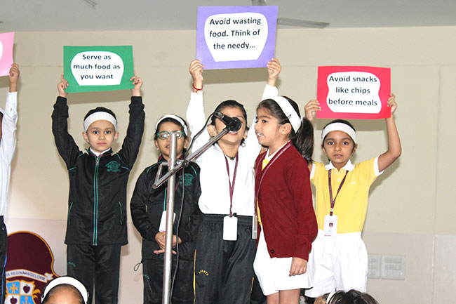 A special assembly on " No Food Wastage Day" was conducted on 20 October 2016 by the students of class I. The important message of not to waste food at home or during any outing was conveyed through a short skit.